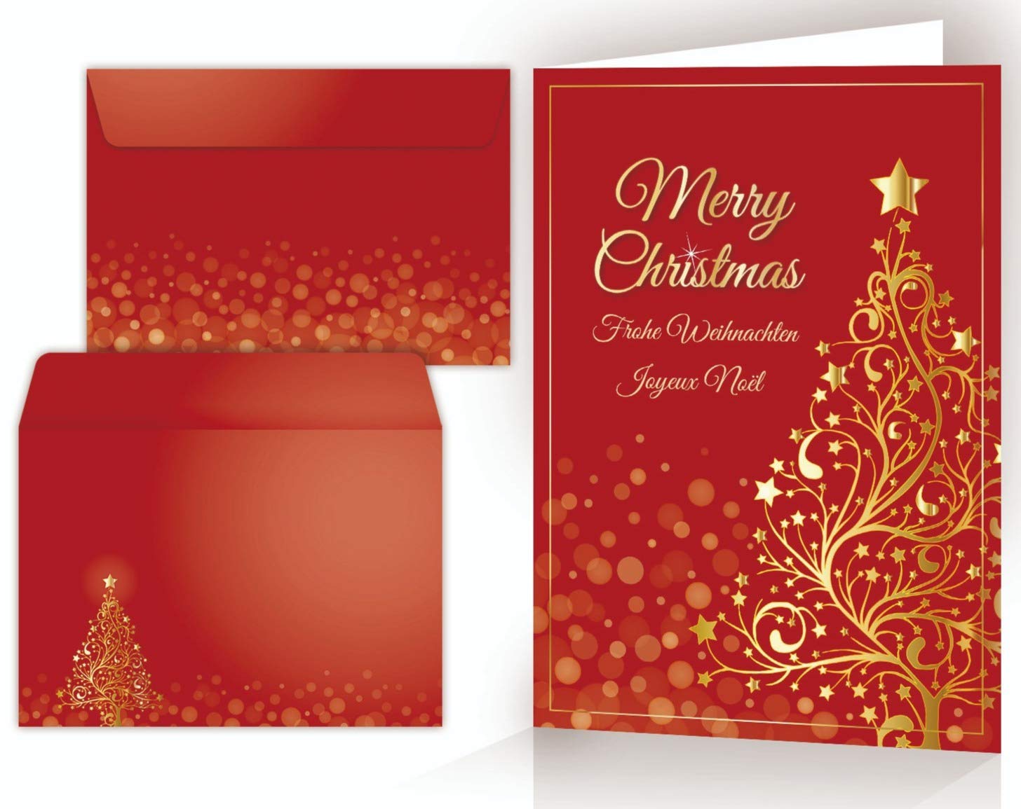 10 ST. KLAPPKARTEN: Sie erhalten 10 hochwertige, mehrsprachige Weihnachtskarten (Format: 14,8 x 10,5 cm) mit einem goldenen Weihnachtsbaum