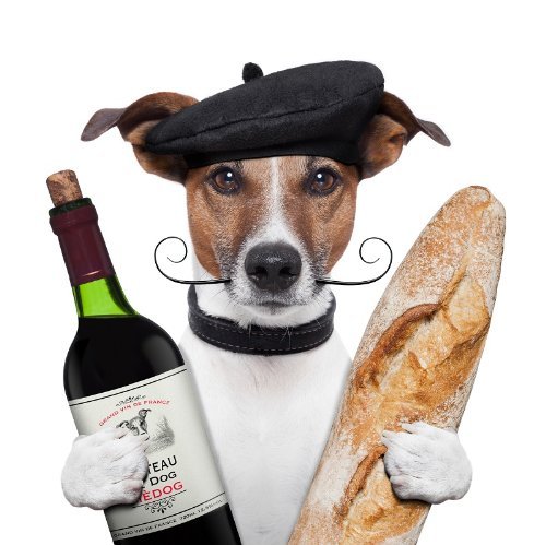 • Brillanter Bilderdruck mit lustigem Motiv von einem Hund mit einem Baguette und einer Rotweinflasche