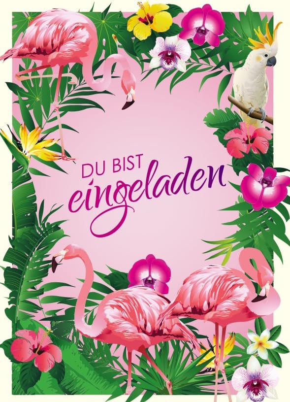 Sie erhalten 10 Einladungskarten zum Aloha-Kindergeburtstag mit Flamingos im Tropical Island oder zur Hawaii-Party im Format 14,8 x 10,5 cm (DIN A 6) - das klassische Postkartenformat