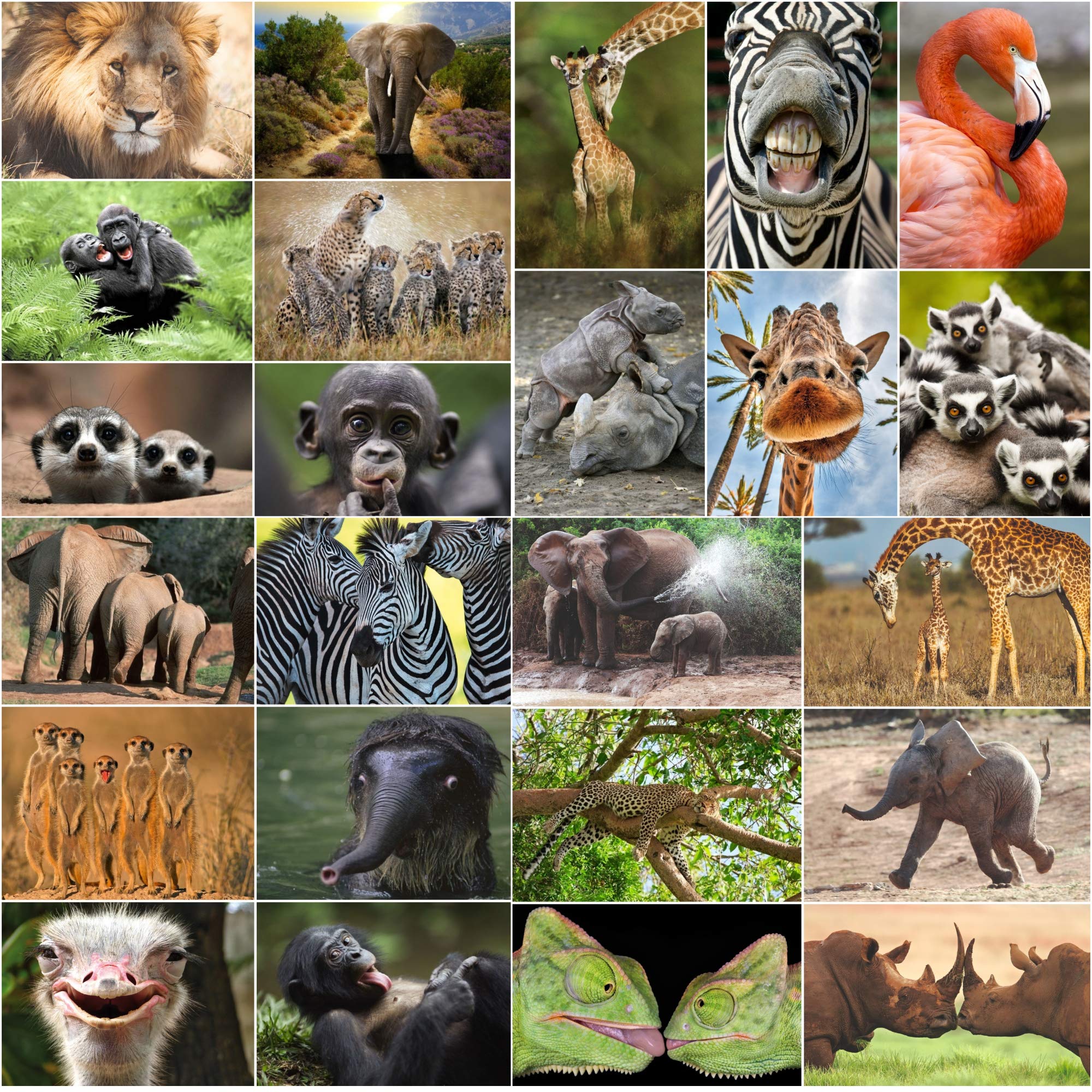Sie erhalten ein umfangreiches Postkarten-Set mit 24 Tierpostkarten von Tieren Afrikas, u.a. Elefanten, Erdmännchen, Nashörner, Giraffen, Affen (Schimpansen, Gorillas), Strauß, Zebras, Geparden, Löwen und Lemuren